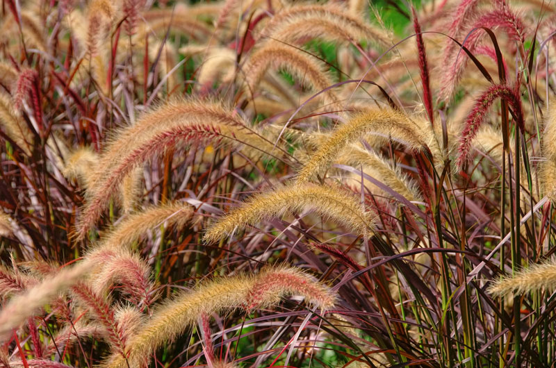 ‘Rubrum’, sometimes commonly called purple or red fountain grass, is a burgundy-red leaved cultivar that is not invasive under any circumstances because, unlike the species, it rarely sets seed. Showy, fluffy, burgundy-purple flowers in bottlebrush-like spikes (to 12” long) top flower stalks that arch upward and outward above the burgundy-red foliage clump in summer.